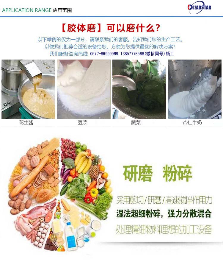 可代替并優(yōu)于石磨,砂磨機(jī)、球磨機(jī)、乳勻機(jī)、乳化機(jī)、三輥機(jī)、搗碎機(jī)等工作。亦可按照客戶對(duì)加工物料不同的酸度、堿度、濃稠度等性質(zhì)特殊要求定制生產(chǎn)。