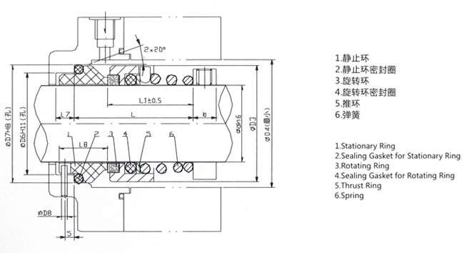單端面、非平衡型、錐形彈簧傳動結(jié)構(gòu),彈簧另一端并圈鎖定在軸上,彈簧旋向與泵軸旋向有關(guān)。